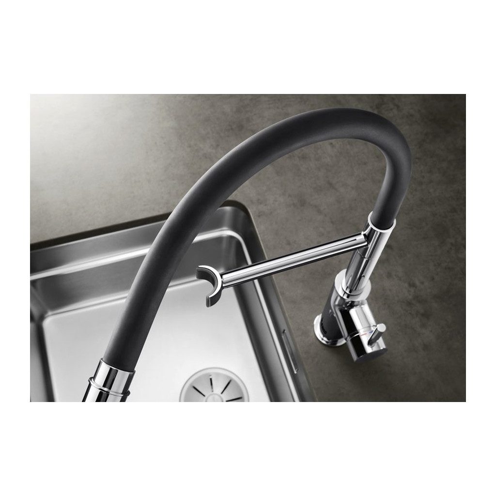 BLANCO Catris-S Flexo je klasická batéria v Semi-Profi prevedení s pohodlným ovládaním a flexibilnou výpusťou (nerezová pružina) s pohyblivou sprškou. Spršku možno ľahko vybrať z držiaka a umiestniť ju aj do kuchýň s hornými skrinkami. Prepínateľná sprška ponúka normálny a sprškový prúd.