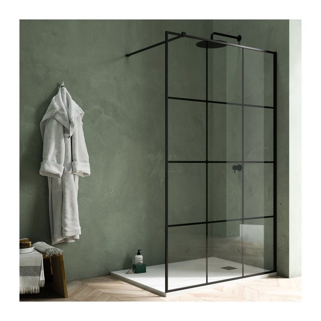 Pevná voľne stojaca stena, elegantná čierna matná. Walk-In stena a dizajn s originálnym sklom s efektom skleníkových okien, ktorý dáva kúpeľni jedinečný moderný a sofistikovaný štýl.