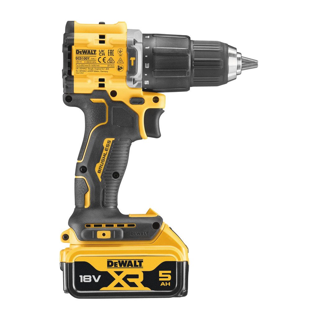 Domov » Náradie » Aku náradie » Vŕtačky a skrutkovače » Príklepové vŕtačky » DeWALT DCD100YP2T – AKU vŕtačka/príklepový skrutkovač 100 rokov DW, 18V XR, 2×5,0Ah, bezuhlíková