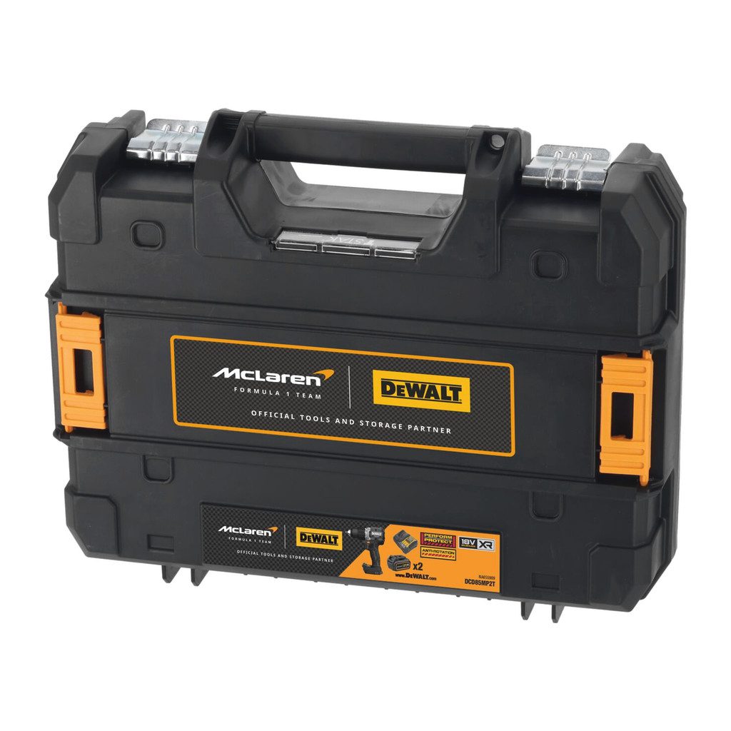 • DCD85MP2T: Súprava obsahuje príklepový vŕtací skrutkovač DCD85M DEWALT X McLaren18 V XR, s 2 akumulátormi s kapacitou 5 Ah a 4A nabíjačkou DCB1104 v kufri kompatibilnom so systémom TSTAK.