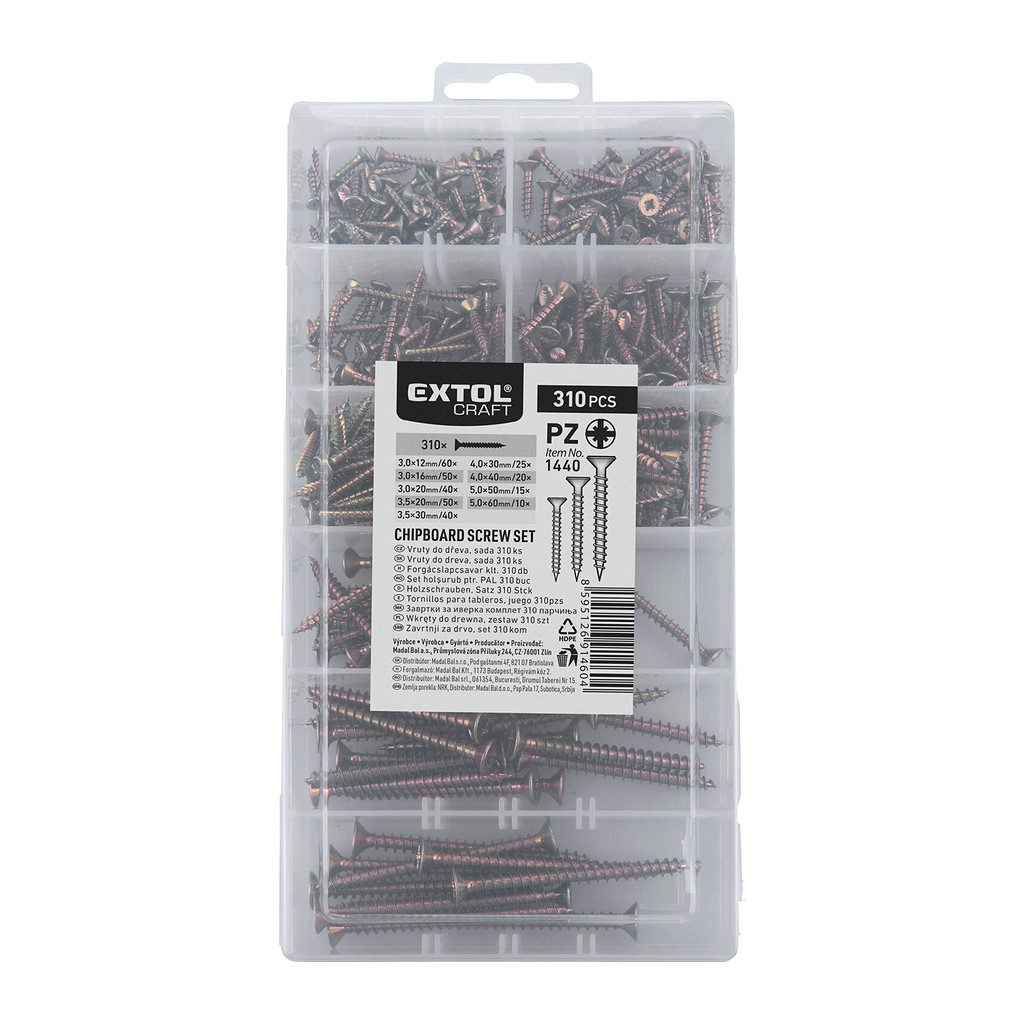 Domov » Náradie » Príslušenstvo » Spojovací materiál » Skrutky » Skrutky do dreva » Extol Craft 1440 – Skrutky do dreva, sada 310 ks