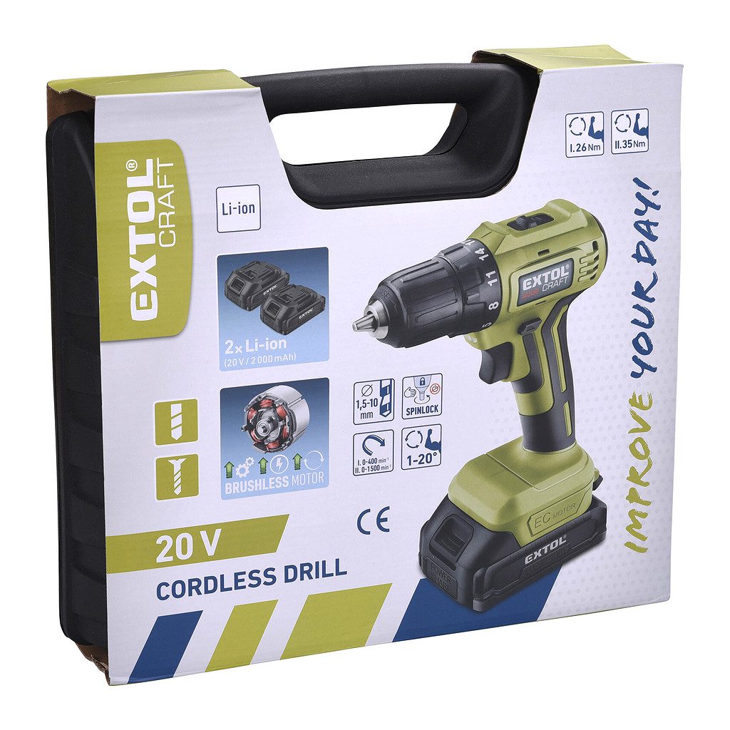 Domov » Náradie » Aku náradie » Vŕtačky a skrutkovače » Vŕtačky / skrutkovače » Extol Craft 402450 – Vŕtačka akumulátorová bezuhlíková, 20V, 1x 2Ah Li-ion