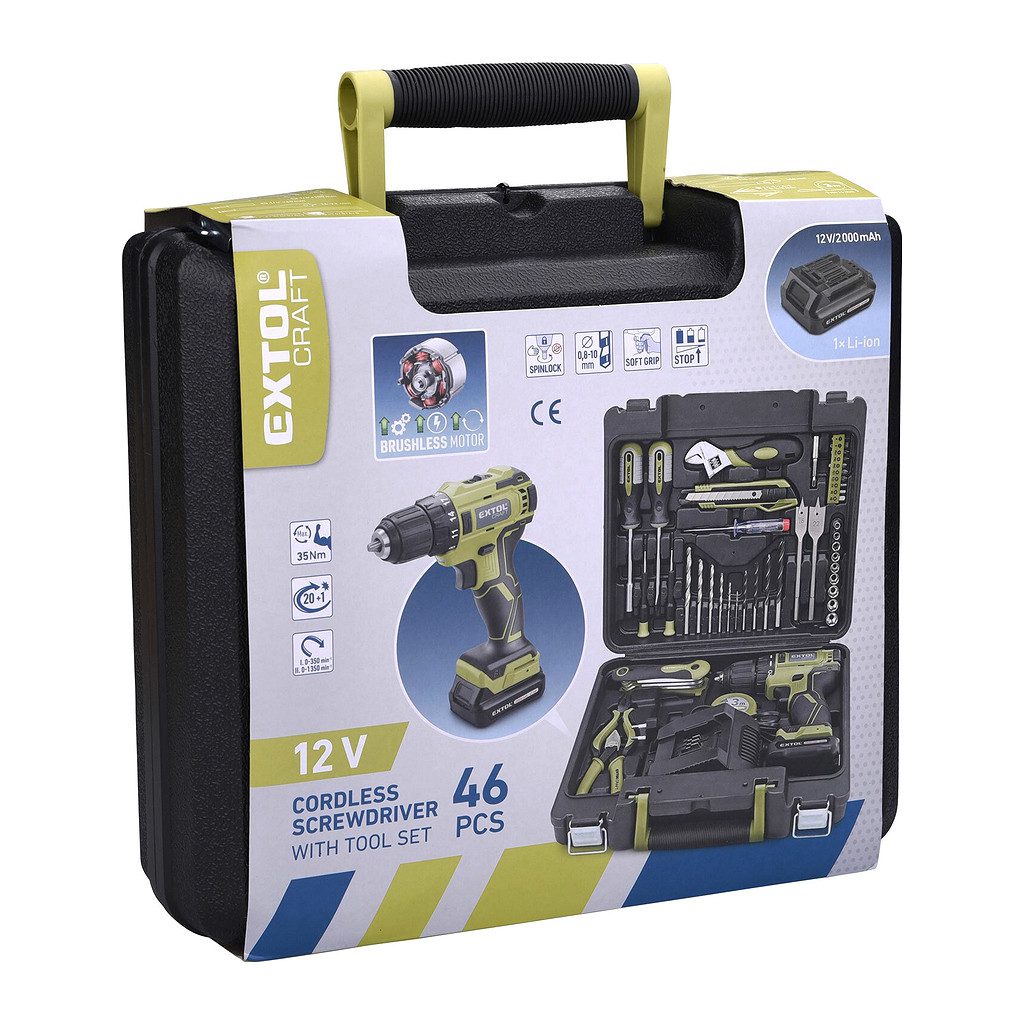 Praktická sada pre domácnosť obsahuje akumulátorový vŕtací skrutkovač, určený na doťahovanie a povoľovanie skrutiek a vrutov, vŕtanie do dreva, kovu a plastov, a tiež vrtáky, bity a základné náradie. Je poháňaný najmodernejším bezuhlíkovým motorom, ktorý má vyššiu životnosť, je výkonnejší a má menšiu spotrebu ako klasické motory s uhlíkovými kefami. Dvojrýchlostná prevodovka umožňuje nastaviť zodpovedajúce otáčky pre konkrétny druh práce. Nástroje sa upínajú do kvalitného skľučovadla s aretáciou. K dispozícii sú 2 režimy práce: vŕtanie a skrutkovanie s 20 stupňami momentu preklzovacej spojky. Integrované LED svietidlo osvetľuje pracovný priestor a pre zlepšenie orientácie v tmavých priestoroch má oneskorené vypnutie. Rukoväť je pokrytá gumou, ktorá znižuje prenos vibrácií do ruky a spolu s nízkou hmotnosťou, ergonomickým tvarom a vyvážením robí prácu príjemnejšou a menej únavnou. Nástrčné hlavice a bity je možné vďaka adaptéru použiť v akumulátorom aj ručnom skrutkovači.