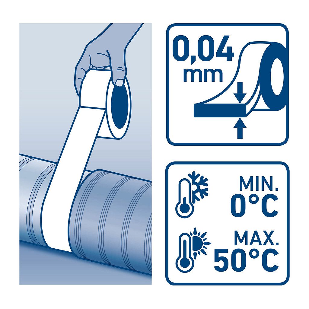 hrúbka (bez lepidla) 0,04mm, použitie v rozmedzí teplôt 0°-50°C,odolná voči vode a vonkajším vplyvom