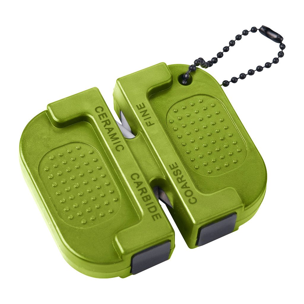 • malá outdoorová brúska na nože s retiazkou pre hrubé brúsenie pomocou dvojice karbidových plátkov a jemné doostrenie pomocou keramických valcov