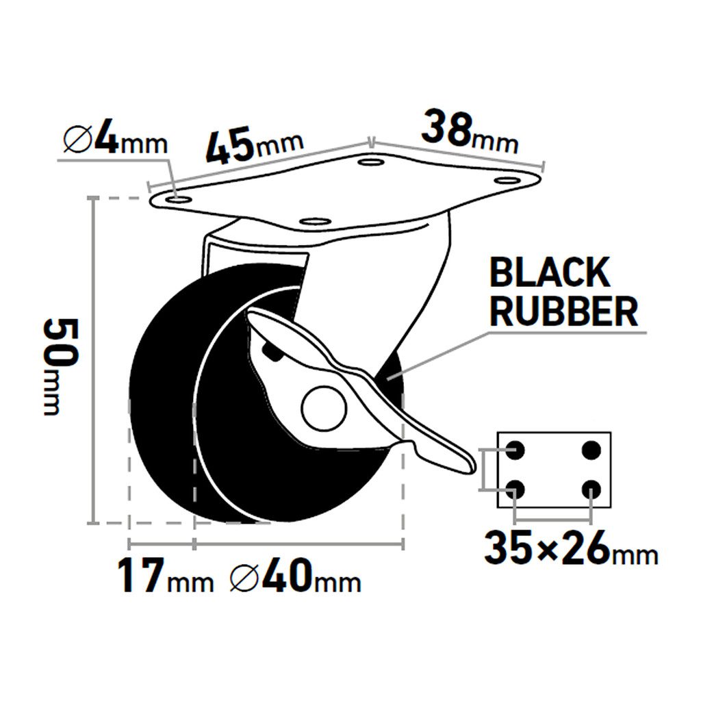 • Doplňujúci parameter: Ø40mm, tvrdosť 78°Shore A, šírka 17mm, nosnosť max. 20kg/1ks, výška vrátane základne 50mm, rozmer základne 45x38mm, rozstup dier 35x26mm (Ø4mm), gumené, oska v plastovom puzdre, čierne