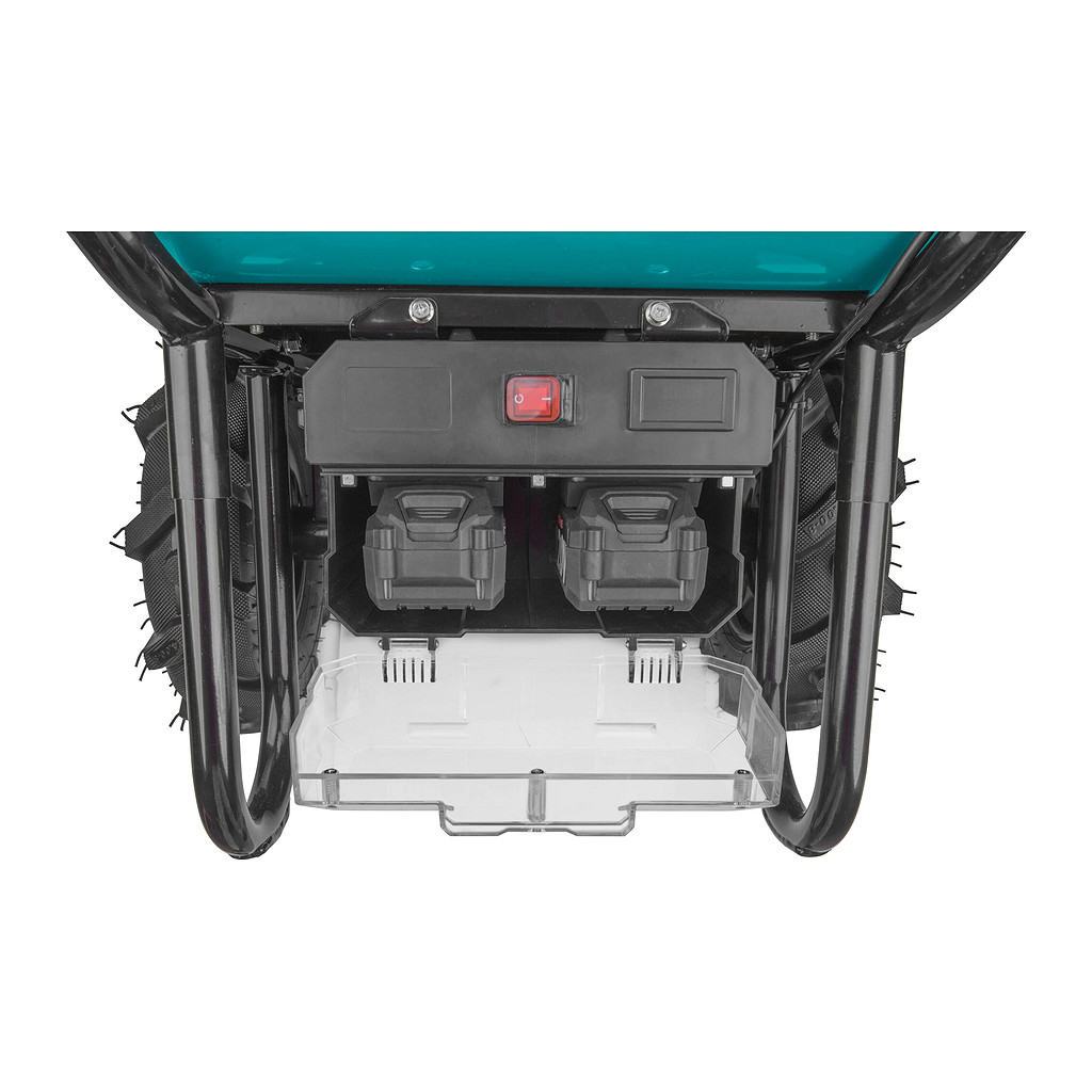 Dvojkolesový fúrik je určený na prepravu tuhých, sypkých alebo hustých materiálov. Elektrický pohon podstatne urýchľuje prepravu a zároveň znižuje únavu počas obsluhy, čo zvyšuje produktivitu práce. Použitie Li-ion batérie výrazne znižuje hmotnosť fúrika oproti modelom, ktoré sú poháňané olovenými batériami. Na pravej rukoväti sa nachádza ovládač, kde je možné pomocou palca nastaviť okamžitú rýchlosť pohybu, voliť jazdu dopredu alebo dozadu, aktivovať brzdu, normálnu alebo Turbo rýchlosť. Pre bežnú prevádzku sa používa normálna rýchlosť, Turbo je možné použiť pri jazde do kopca, v ťažkom teréne alebo pri preprave ťažšieho nákladu. Fúrik je poháňaný najmodernejším bezuhlíkovým 40V motorom. Tento nový typ motora má vyššiu životnosť, je výkonnejší a má menšiu spotrebu elektrickej energie ako klasické motory s uhlíkovými kefami. Ak je to nutné, je možné motor kompletne vypnúť a používať fúrik len na ručný pohon. Zabudovaná prevodovka s diferenciálom výrazne zlepšuje priestupnosť terénom a výkon motora pri jazde do kopca. Vďaka umiestneniu ťažiska nákladu nad osou kolies je väčšina hmotnosti nákladu umiestnená na kolesách a obsluha takmer nič nenesie. Elektrická brzda sa používa ak je potrebné zamedziť pohybu fúrika na mieste. Kolesá s hlbokou vzorkou do terénu poskytujú dobrú trakciu. Fúrik je dodávaný s kovovou korbou s objemom 100l, lisovanou z jedného kusa plechu. Pre prepravu pevného objemnejšieho nákladu (napr. krabice, polená…) je možné dokúpiť rámovú konštrukciu, ktorá sa priskrutkuje namiesto korby. Elektronika fúrika má krytie IP64, čo mu umožňuje dočasnú prácu vo vlhkom prostredí, prípadne umývanie prúdom vody, nie je ale určený na trvalú prevádzku alebo skladovanie vo vlhkom prostredí. Pre jednoduchšiu prepravu v aute je možné sklopiť rúčky, takže sa fúrik zmestí aj do menšieho auta. Zdrojom elektrickej energie sú silné Share20V akumulátory, ktoré sa predávajú samostatne. Z dôvodu vysokého odberu je nutné použiť 6Ah alebo 8Ah verziu. Výhodou použitia Share20V akumulátorov je, že keď fúrik nepoužívate, môžete ich tiež používať v našom neustále rozširujúcom sa sortimente náradia používajúceho rovnaký typ akumulátora. Vyberateľné batérie umožňujú ich ľahké nabíjanie a skladovanie v suchom a zateplenom prostredí, čo je veľmi dôležité pre ich životnosť. Batérie majú ochranu proti vybitiu pod minimálnu úroveň, pred preťažením pri nadmernom odbere prúdu, prebitím, skratom a náhlemu zvýšeniu teploty pri práci.