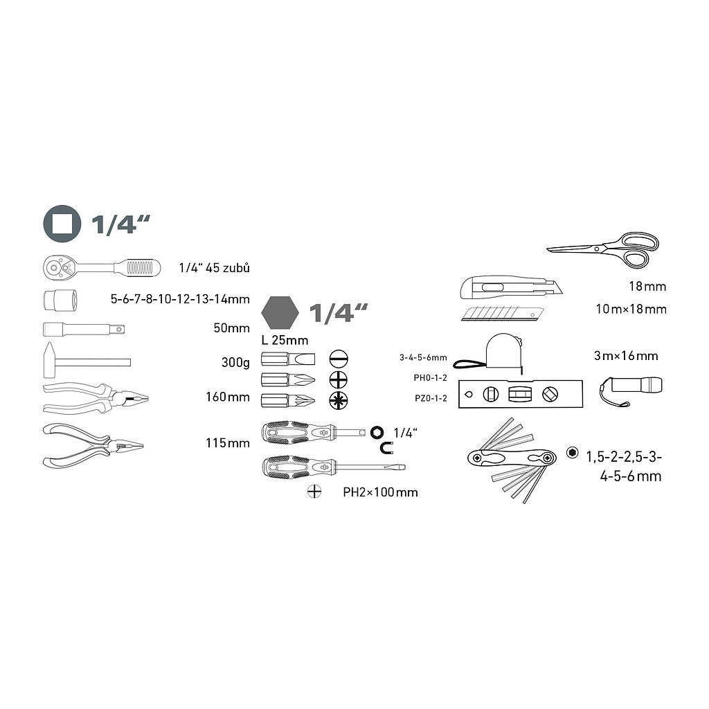 • Hlavice nástrčné: 1/4″: 5-6-7-8-9-10-12-13-14mm (CrV)