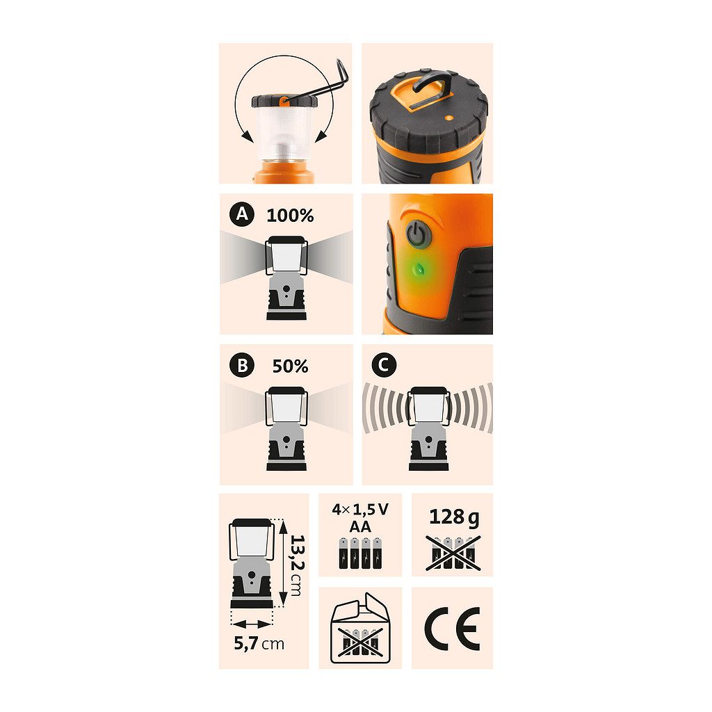 • Doplňujúci parameter: 3W CREE LED, svietivosť 150lm, 3 režimy svietenia: 100%, 50% a blikanie, napájanie 4×1,5V AA, vodeodolné, háčik na zavesenie zhora aj zospodu, blikajúca LED určuje polohu spínača aj v tme, rozmery (š x v): 57 x 132mm, hmotnosť bez batérií 128g