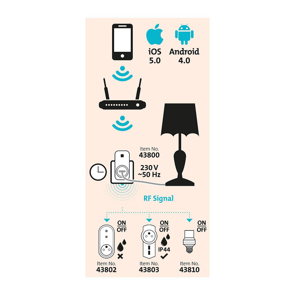 • Doplňujúci parameter: max. pripojiteľný príkon 3680W (16A), ovládateľná pomocou aplikácie pre smatfón alebo tablet, manuálne alebo automatické spínanie, režimy automatického spínania: časovač, odpočet času, trvalé vypnutie v určený čas, schopnosť ovládať ďalšie prvky pomocou RF signálu, max. dosah RF signálu 30m, stupeň ochrany IP20