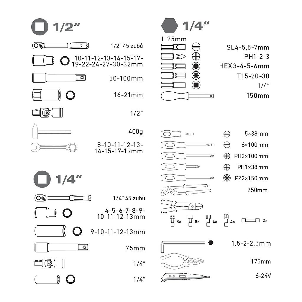 • Hlavice nástrčné: 1/4″: 4-5-6-7-8-9-10-11-12-13mm, 1/2″: 10-11-12-13-14-15-16-17-19-22-24-27-30-32mm