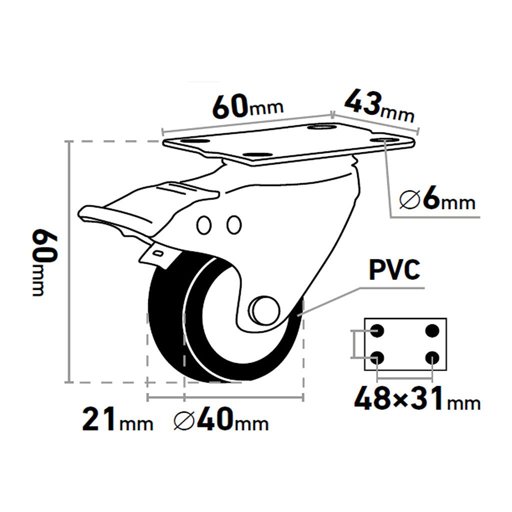 • Doplňujúci parameter: Ø40mm, šírka 21mm, nosnosť max. 30kg/1ks, výška vrátane základne 60mm, rozmer základne 60x43mm, rozstup dier 48x31mm (Ø6mm), PVC, oska na ložiskách, čierne