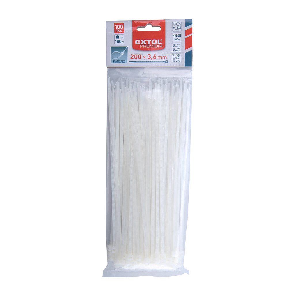 Domov » Náradie » Ručné náradie » Sťahovacie pásky » Biele » Extol Premium 8856106 – Pásky sťahovacie biele, 3,6x200mm, 100ks, Ø50mm, 18kg