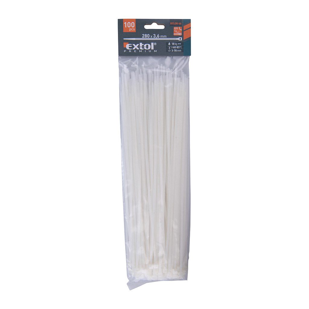 Domov » Náradie » Ručné náradie » Sťahovacie pásky » Biele » Extol Premium 8856108 – Pásky sťahovacie biele, 3,6x280mm, 100ks, Ø70mm, 18kg