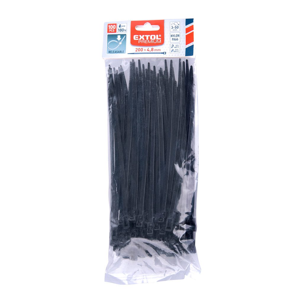 Domov » Náradie » Ručné náradie » Sťahovacie pásky » Čierne » Extol Premium 8856254 – Pásky sťahovacie čierne, rozpojiteľné, 4,8x200mm, 100ks