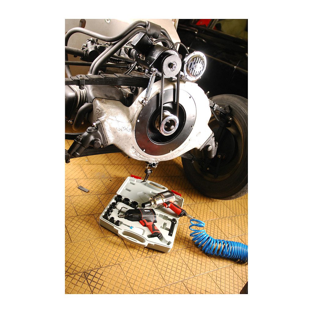 • kufor s príslušenstvom: rázové nástrčné kľúče 9-10-11-13-14-17-19- 22-24-27mm, nadstavec 125mm, imbusový kľúč, olejnička, 1/4“ konektor rýchlospojky