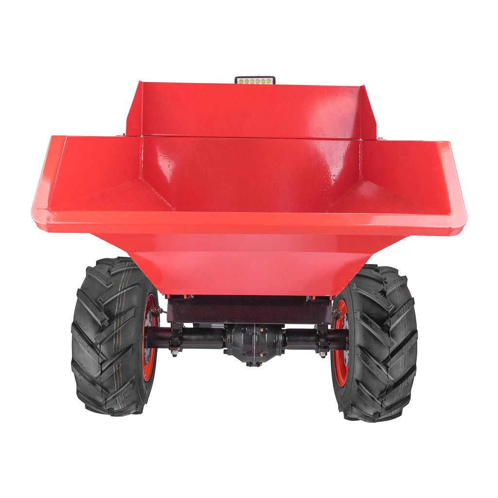 Transportér je určený na prepravu tuhých, sypkých alebo hustých materiálov. Vďaka elektrickému pohonu výrazne urýchľuje prepravu materiálu a zároveň znižuje únavu obsluhy, čo zvyšuje produktivitu práce. Stroj má na pravej rukoväti ovládač, kde si pomocou palca nastavíte okamžitú rýchlosť smerom dopredu aj dozadu. Na ovládači je možné prepínať smer jazdy, voliť normálnu rýchlosť alebo Turbo a ovládať brzdu. Pre bežnú prevádzku sa používa normálna rýchlosť, Turbo je možné použiť pri jazde do kopca, v ťažkom teréne alebo pri preprave ťažšieho nákladu. Transportér je poháňaný najmodernejším bezuhlíkovým motorom, ktorý má vyššiu životnosť, je výkonnejší a má menšiu spotrebu elektrickej energie ako klasické motory s uhlíkovými kefami. Ak je to nutné, je možné motor kompletne vypnúť a používať transportér len na ručný pohon. Zabudovaná prevodovka s diferenciálom výrazne zlepšuje priestupnosť terénom a účinnosť výkon motora pri jazde do kopca. Váha celého nákladu je sústredená nad osou kolies a neprenáša sa na rukoväte, obsluha len riadi smer. Stroj je vybavený dvoma brzdami – elektrickou, ktorú je možné aktivovať na ovládači a manuálnou, ktorá slúži jednak na pribrzďovanie pri jazde z kopca, ale vďaka poistke je možné ju tiež použiť ako parkovaciu brzdu. Pneumatiky majú hlbokú vzorku do terénu s dobrou trakciou. Transportér je dodávaný s kovovou korbou s objemom 200l pre sypký materiál. Je možné s ním pracovať aj za daždivého počasia a je vybavený silným LED svetlom na prácu za zníženej viditeľnosti. Pred naložením do auta môžete vysunúť rukoväte, aby sa zmenšila dĺžka pri preprave. Zdrojom elektrickej energie pre pohon je silný 54V/15Ah Li-ion akumulátor s LED displejom ukazujúcim úroveň nabitia a okamžité napätie. Akumulátor je odnímateľný, čo umožňuje ľahké nabíjanie a skladovanie v suchom a zateplenom prostredí, čo je veľmi dôležité pre jeho životnosť. Má ochranu proti vybitiu pod minimálnu úroveň, proti preťaženiu pri nadmernom odbere prúdu, prebitiu, skratu a náhlemu zvýšeniu teploty pri prevádzke.