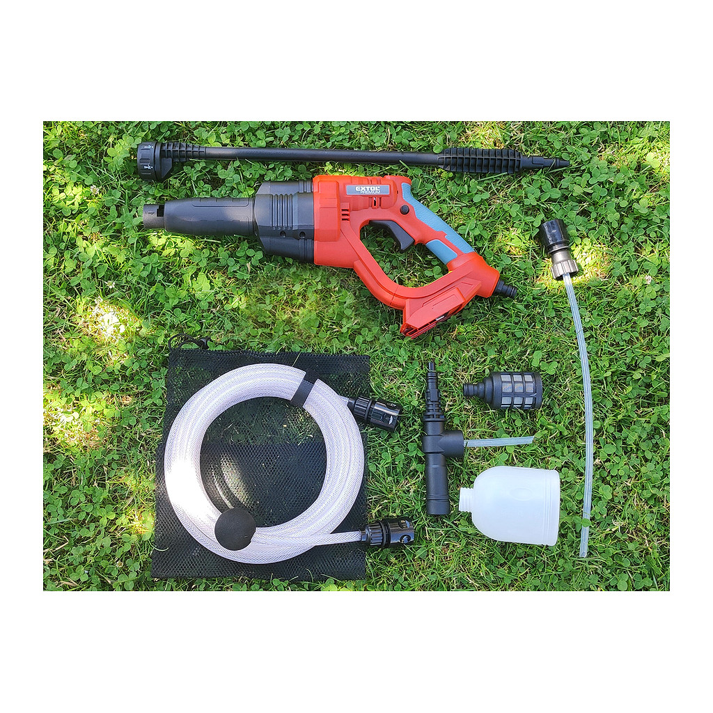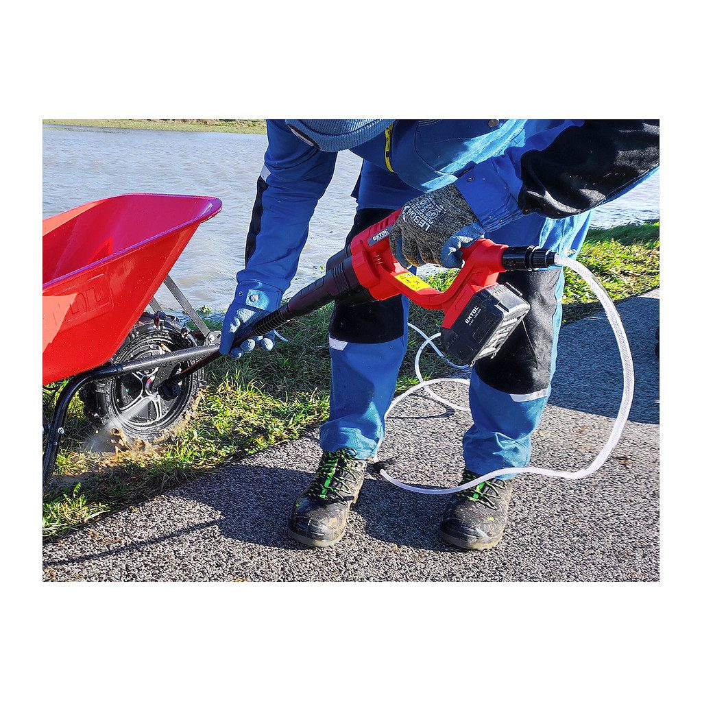 Akumulátorový tlakový čistič je určený na tlakové čistenie vodou s max. tlakom 22bar. Vďaka napájaniu z batérie a funkcii samonasávania vody ho môžete použiť prakticky kdekoľvek a ľahko umyť napr. bicykel, auto, chodník či terasu, záhradný nábytok, umývateľnú fasádu, alebo po prestavení dýzy zalievať kvety. Čistič je možné pripojiť rýchlospojkou na klasickú záhradnú hadicu pripojenú na vodovodný rozvod alebo použiť priloženú hadicu so sacím košom a použiť voľne prístupnú zásobu vody z vedra, rieky, jazera, suda s dažďovou vodou a pod. Pri napájaní z vodovodného rozvodu je možné aku čistič použiť aj bez batérie, avšak výstupný tlak vody z dýzy bude výrazne nižší. S priloženým adaptérom je možné v núdzi použiť aj vodu z bežnej PET fľaše. Vďaka nízkej spotrebe vody je možné čistič veľmi dobre používať aj s menším objemom vody. Stroj je vybavený multifunkčnou dýzou so 6 nastaviteľnými typmi lúčov: priamy prúd, vejár 15˚, 25˚ a 40˚, bočný lúč pod uhlom 45˚ na umývanie napríklad strechy alebo podvozku auta a režim sprchy, ktorý sa dá použiť aj na zalievanie kvetov. Pre zvýšenie účinnosti čistenia je možné k čističu pripojiť šampónovací adaptér s nádobkou na čistiaci prostriedok určený pre tlakové vodné čističe s nízkotlakovým šampónovaním. Pripojenie hadice v zadnej časti čističa zlepšuje manipuláciu pri práci.