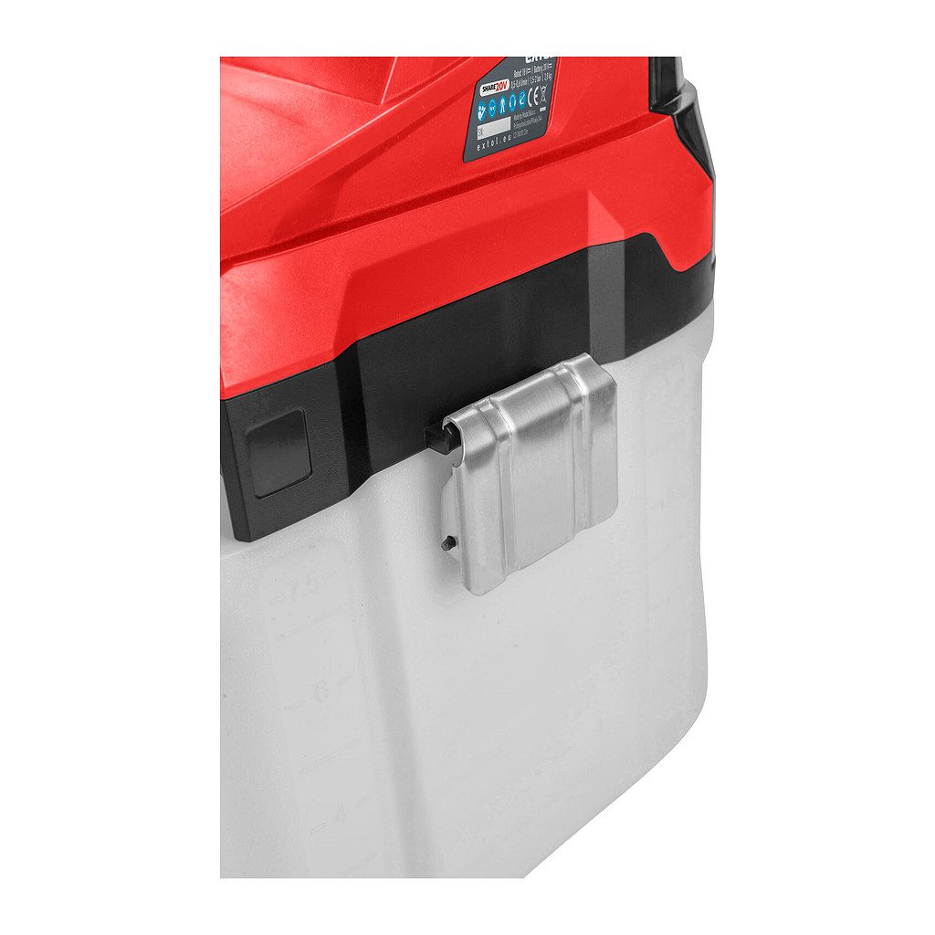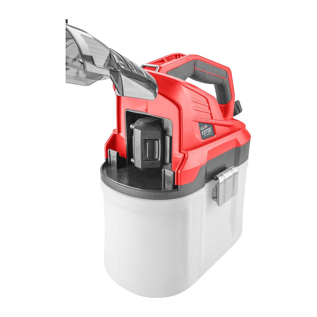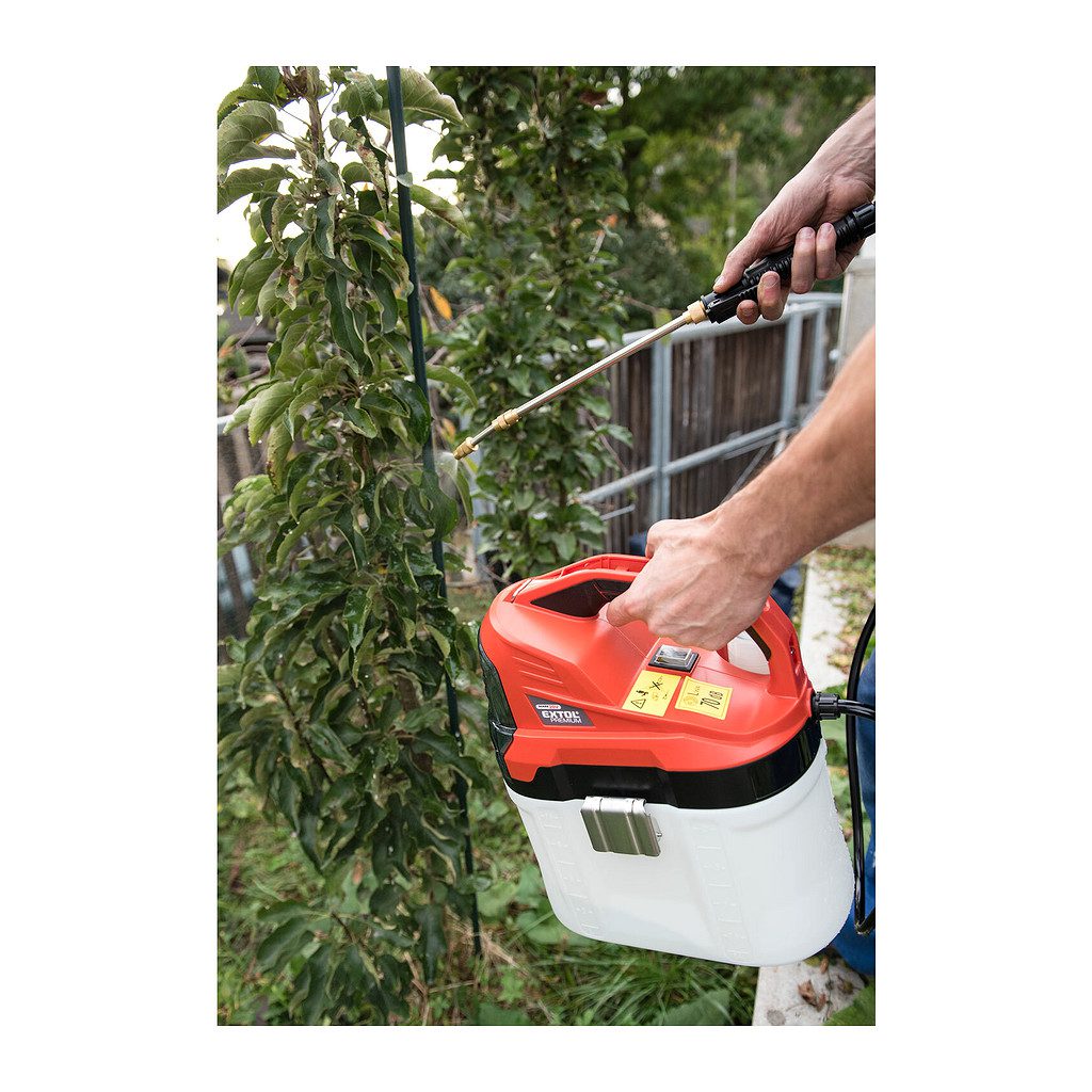 Tlakový akumulátorový postrekovač je určený na striekanie čistej vody na rosenie či zalievanie rastlín, riedených prostriedkov proti škodcom rastlín (insekticídov, fungicídov), prostriedkov na ničenie burín (herbicídov) a tiež vodných roztokov hnojív pre rastliny. Je tiež možné ho použiť na postrekovanie s ekologicky šetrnými ochrannými prostriedkami s obsahom repkového alebo nimbového oleja, pokiaľ tieto prostriedky obsahujú emulgátory oleja, ktoré zamedzujú oddeleniu olejovej zložky od vody a vytvárajú jemnú emulziu oleja vo vode. Postrekovač nie je možné používať s hustými kvapalinami alebo s kvapalinami s dvoma oddelenými samostatnými fázami. Vďaka napájaniu postrekovača z batérie s vysokou výdržou (až 236l/2Ah batériu) je postrekovanie veľmi komfortné. Postrekovač je možné používať buď zavesený cez rameno, alebo vďaka veľkej ploche dna, nádobu postaviť na zem. Dýzu je možné plynule nastaviť na režim rozprašovania (vejár) až po lúč vody s dostrekom až 7,6m, ktorý je vhodný napr. pre zalievanie. Optimálna vzdialenosť pre postrek je 60cm od konca dýzy. Dĺžka postrekovacej rúrky s dýzou je teleskopicky nastaviteľná v rozsahu 32-52cm. Zátka nádrže postrekovača slúži zároveň ako odmerka na meranie objemu prípravku, stupnica na nádrži uľahčuje sledovať pomer riedenia. Spúšť je možné zaistiť v stlačenej polohe pre dlhodobejšie striekanie. Čerpadlo sa automaticky vypne po prerušení striekania pre zabezpečenie dlhšej výdrže batérie. Batéria je pred poškodením striekajúcou vodou chránená ochranným krytom celého batériového priestoru. Čerpadlo aj dýza sú chránené pred upchatím pevnými časticami sitkom na nasávacej hadičke čerpadla a tiež v rukoväti postrekovacej hubice. Pre jednoduchšiu manipuláciu a uskladnenie je možné rukoväť postrekovacej hubice vložiť do vrchnej časti madla postrekovača. Akumulátor je možné použiť vo všetkých typoch náradia rady Extol Share20V. Vďaka Li-ion technológii je možné akumulátory kedykoľvek dobíjať, bez toho aby sa tým znižovala ich kapacita, akumulátor stráca energiu vplyvom samovybíjania veľmi pomaly a vydrží dlho nabitý a pripravený na použitie.