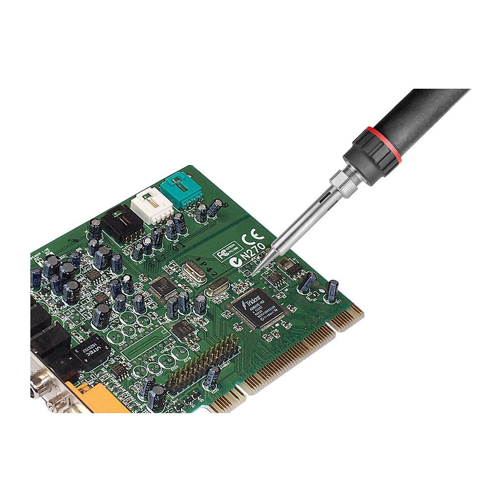 Hrotová spájkovačka je určená na mäkké spájkovanie, ktoré vyžaduje presnosť a kontrolu teploty hrotu, najmä pri práci s elektronikou a bižutériou. S použitím vhodného spájkovacieho hrotu je možné spájku použiť aj na drobné rezanie či spájanie plastov a tiež na vypaľovanie symbolov do dreva. V spájkovačke sa používajú štandardné hroty typu 900M. Hrot je nahrievaný keramickým telesom s vnútorným výhrevným prvkom. Tepelný senzor zabezpečuje spätnú kontrolu teploty hrotu a udržuje nastavenú teplotu pri spájkovaní. Pomocou regulačného kolieska nastavíte teplotu v rozsahu 100-480°C. Spájkovačka je vybavená funkciou kalibrácie, ktorá umožňuje presnejšie nastavenie teploty hrotu vzhľadom na jeho veľkosť. Funkcia ESD ochráni proti výboju statickej elektriny. Plastový prechod medzi kovovou a plastovou časťou je vyrobený zo špeciálneho vysoko tepelne odolného plastu a rúčka je potiahnutá silikónom pre príjemné držanie pri práci. Súčasťou balenia je jednoduchý stojan na odloženie spájkovačky.