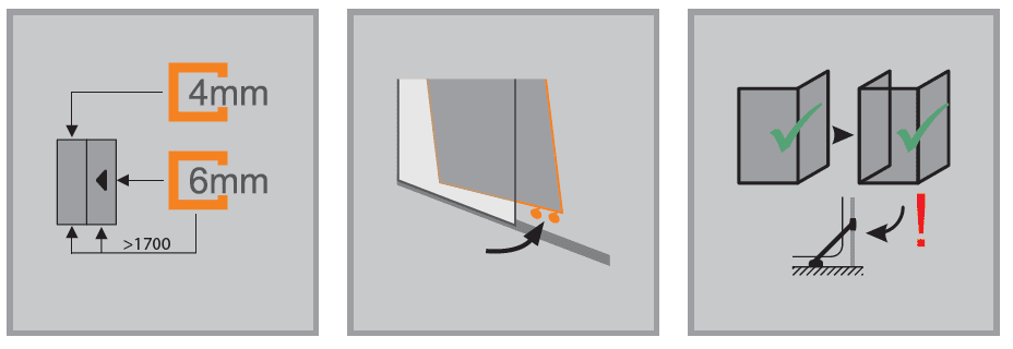 • Zasklenie 6 mm (dvere) a 4 mm (pevný segment) jednovrstvovým bezpečnostným sklom podľa normy DIN EN 12150, voliteľne s povrchovou úpravou HÜPPE Anti-Plaque, ktorá umožňuje jednoduchú údržbu