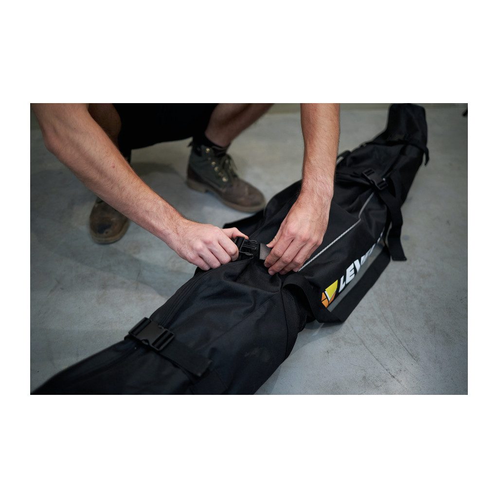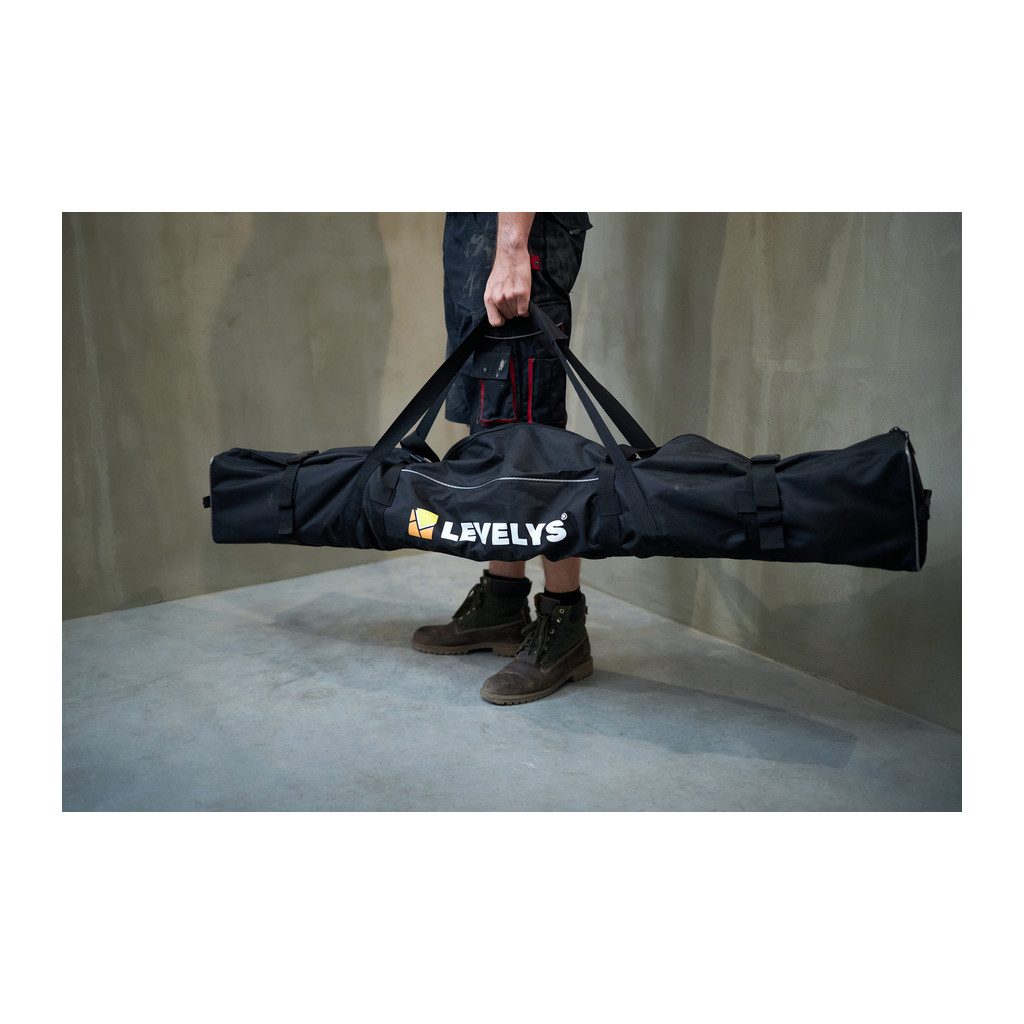 Kvalitný materiál v kombinácii až so 4 sťahovacími popruhmi zaistí dostatočnú ochranu a pohodlnú manipuláciu. Polstrovaný popruh na držanie vaku sa dá využiť aj cez rameno. Do vaku sa zmestí až 12 m zakladacieho profilu LEVELYS (napríklad 4 x 150 cm profil + 4 x 100 cm profil + 4 x 50 cm profil + nastaviteľné nožičky a predĺženie).