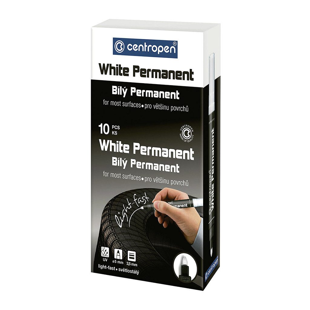Univerzálny biely svetlostály permanentný popisovač s okrúhlym hrotom s atramentom na vodnej báze, vhodný na väčšinu povrchov. Po zaschnutí odolá vode, poveternostným podmienkam aj oteru.