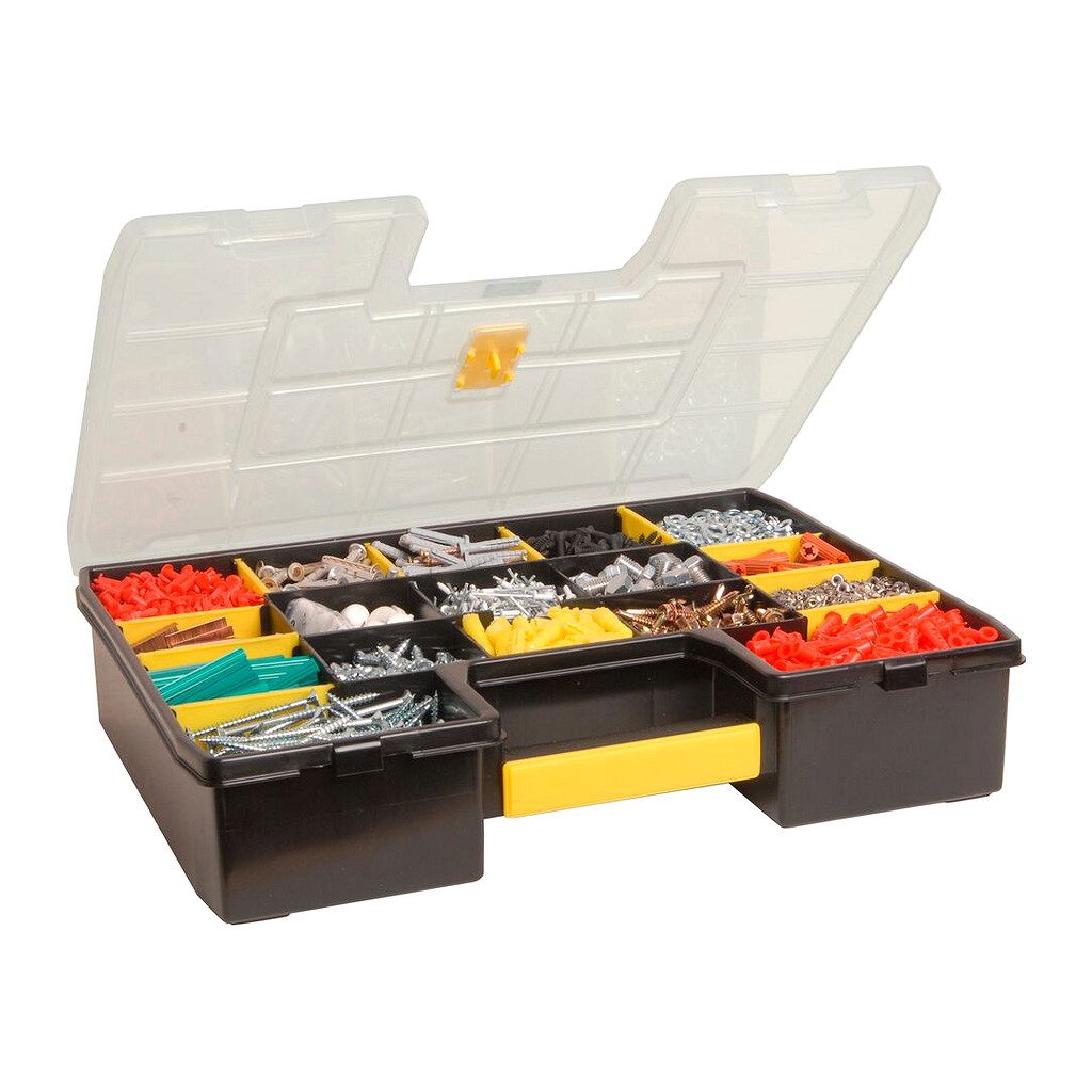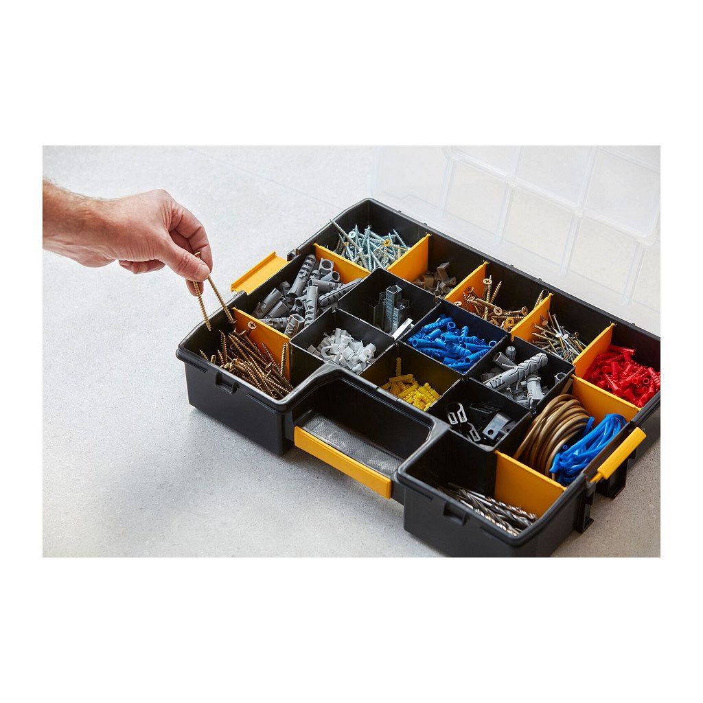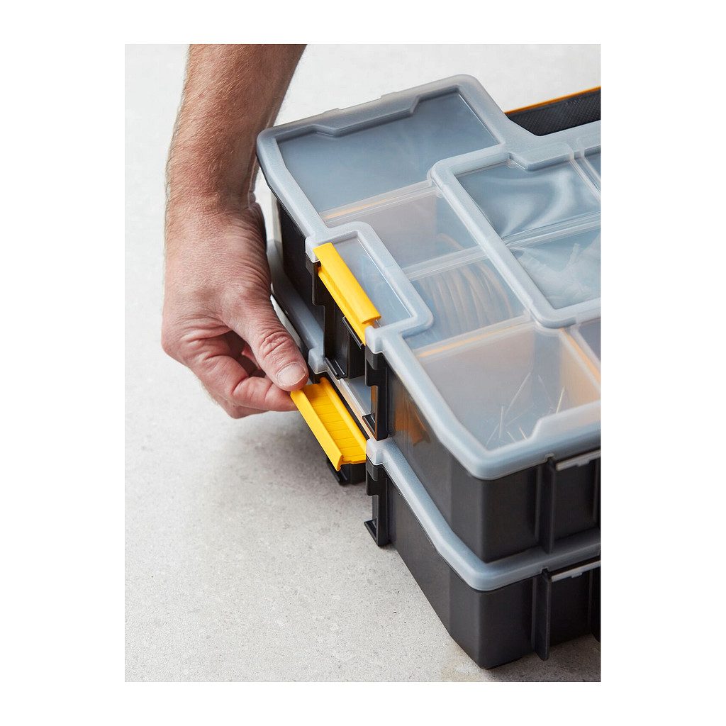 • Špeciálny design vrchnáku zaisťuje pevné držanie priehradiek – zabraňuje tak vysypaniu súčiastok uložených v priehradkach organizéra