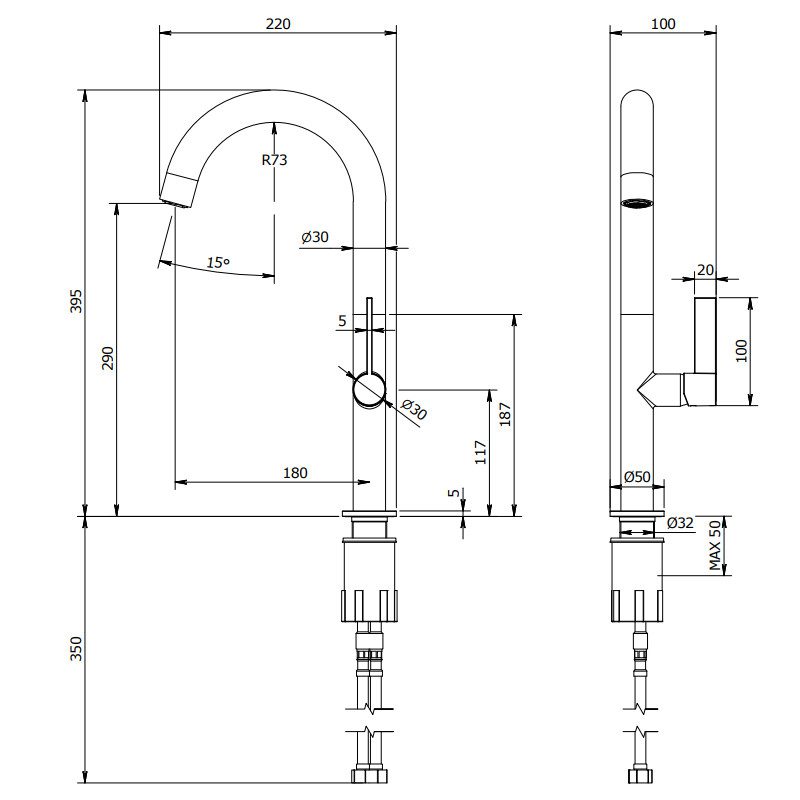 • Výtokové rameno v tvare „J“