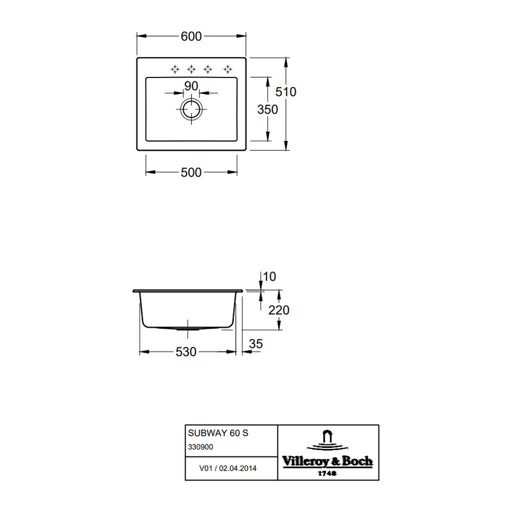 Villeroy & Boch SUBWAY : keramický drez, umývadlo, 600x510mm pre 1-otvorovú batériu, biela Alpin CeramicPlus, 330901R1